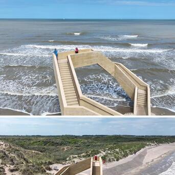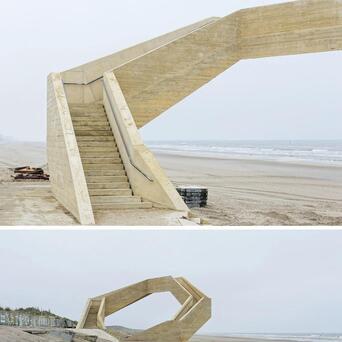 观景台设在滨海长廊的斜坡上,其在规模、高度、形状、颜色、材料和位置选择方面与沙滩紧密结合,从而更加突出了当地的独特风光。
